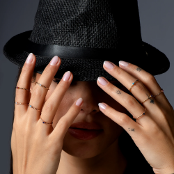 Die Mischung zwischen den schwarzen Diamanten von 0,11 Karat und dem Glanz dieses Goldrings lässt Sie unverwechselbar und zart aussehen. Tragen Sie sie und betonen Sie nach außen die Kraft, die in Ihnen steckt. Alle unsere Schmuckstücke sind handgefertigt und werden nach den EU-Standards hergestellt..